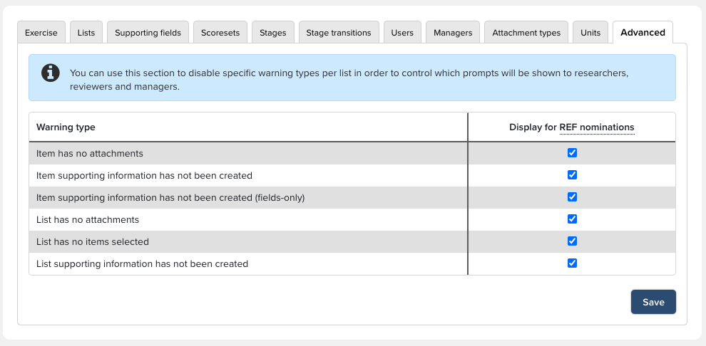 Advanced - Under the Advanced tab, specific warning types can be disabled in order to control which prompts will be shown to researchers, reviewers and managers.