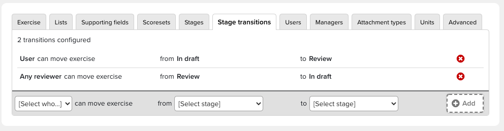 Using the Stage Transitions tab, the Assessment Manager can define which Roles (User, Reviewer) can move an Assessment Exercise from stage to stage and in which direction (next stage/previous stage).