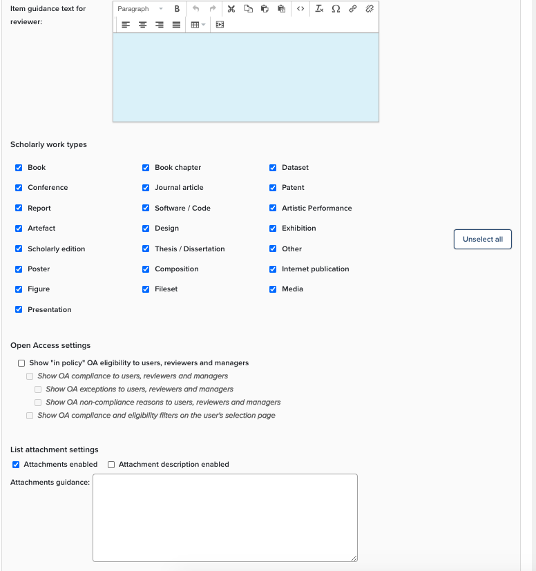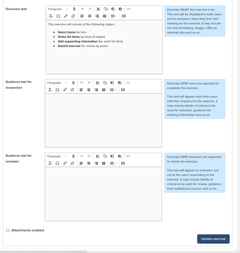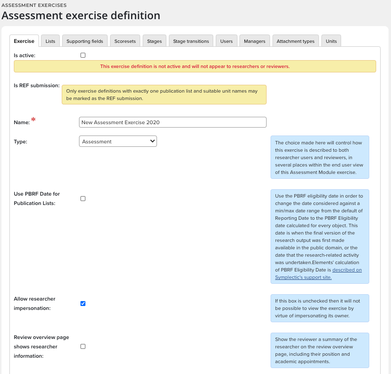 Managers can also be assigned at the unit level, granting those managers permissions only over the users allocated to their unit(s) rather than over the exercise definition as a whole. When setting up an exercise definition which will be subdivided into units it is recommended that the standard exercise definition includes each supporting field that anyone in any of the units will be asked to complete. This forms the default configuration which can then be overridden for each unit. For each of the different units in an exercise definition administrators can selectively hide supporting fields on each unit, modify the in-place guidance about each supporting field, and change the settings for attachments. Administrators can also override the guidance for researchers and reviewers to allow them to ensure each unit has clear instructions about the exercise they are being asked to complete.
