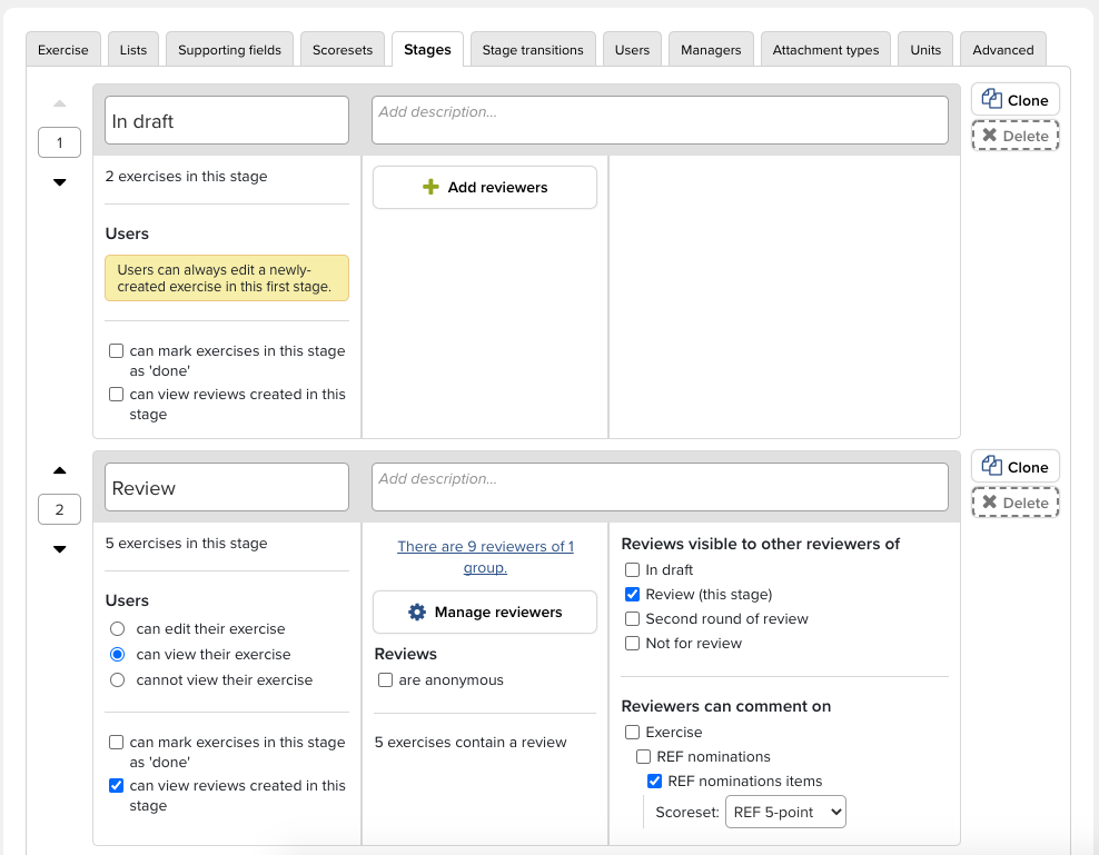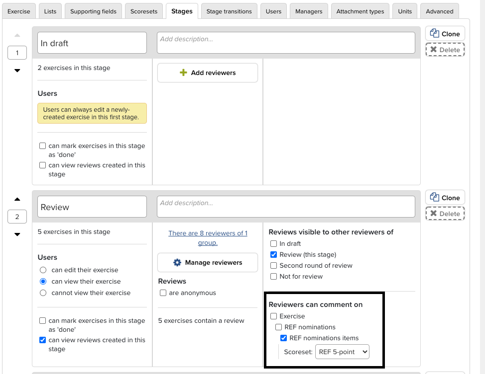Stages - Included in this section are the ability to define how many stages an exercise includes, as well as who can view, edit, or mark an exercise as 'done.' Additionally, Reviewers are assigned here, as well as what stages reviewers can view or upon which they may comment.