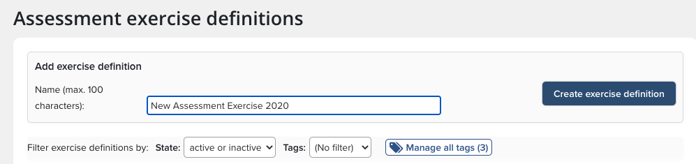 Only a System Administrator can create a new Assessment Exercise. To add a new exercise, begin by clicking on"Exercise definitions" link. In the text box, enter the name of the new exercise and then click the "Create exercise definition" button.