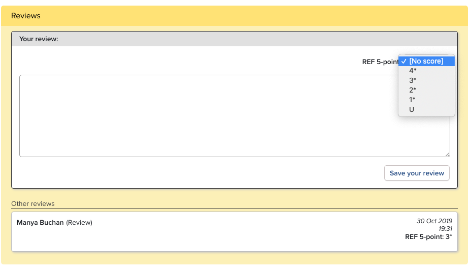 Assessment exercise administrators can configure a number of optional scoresets to complement the existing reviewer comment functionality. A scoreset is a collection of ordered choices for reviewers to choose from.