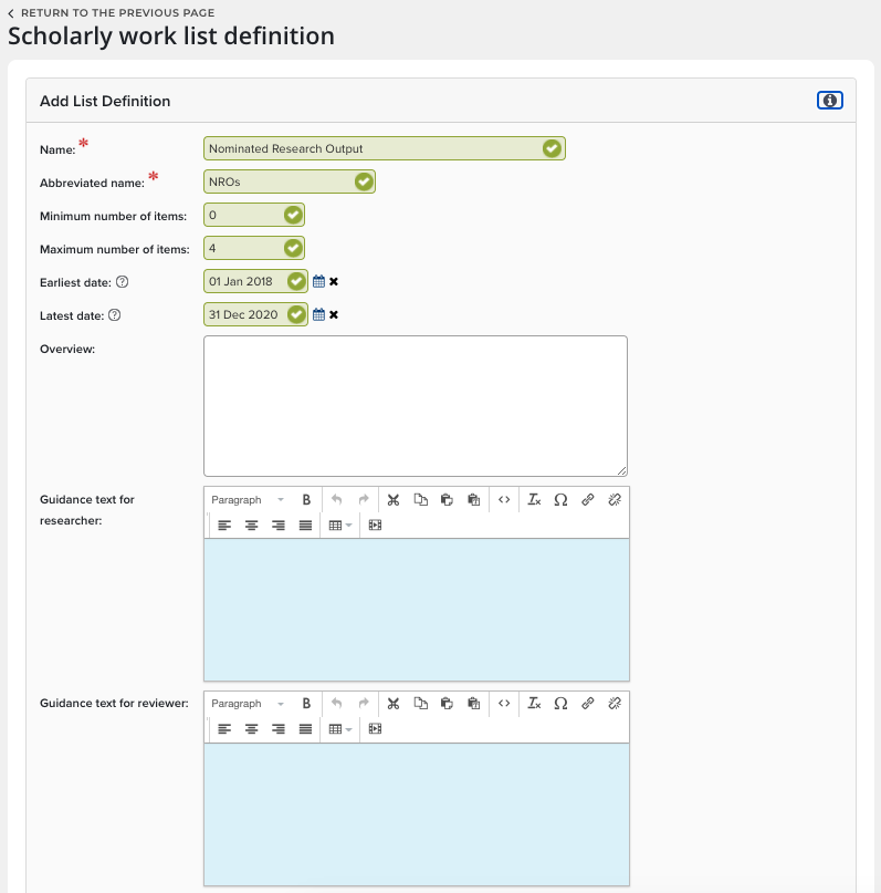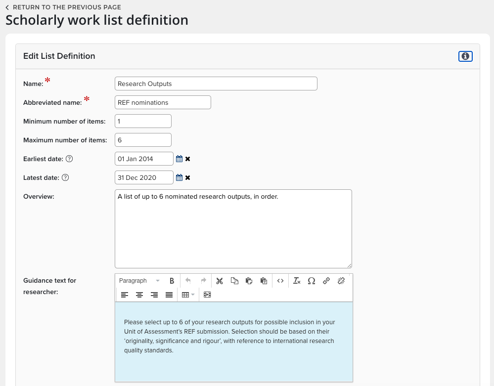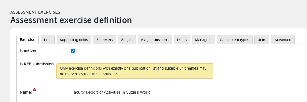 Assessment Exercise is made up of lists and supplementary information, like summaries or description fields. Examples of names of Assessment Exercises include as REF, PBRF, Research Quality Review or others defined by your institution.
