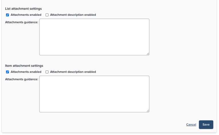 Item settings: This section allows you to enable ratings and reviews for each item in a list and determine the associated privacy settings. You can also enable attachments that can be added for an item and enable the file types defined in the exercise definition.