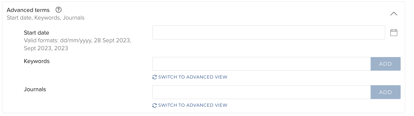 Advanced Terms such as Start Date, Keywords and Journals can be used to restrict the number of articles returned by a search.