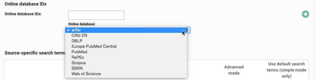 In the example above (ArXiv), you can add your personal Author Identifier and any categories under which you publish to the search criteria, and these will be submitted to the relevant database at the next search.