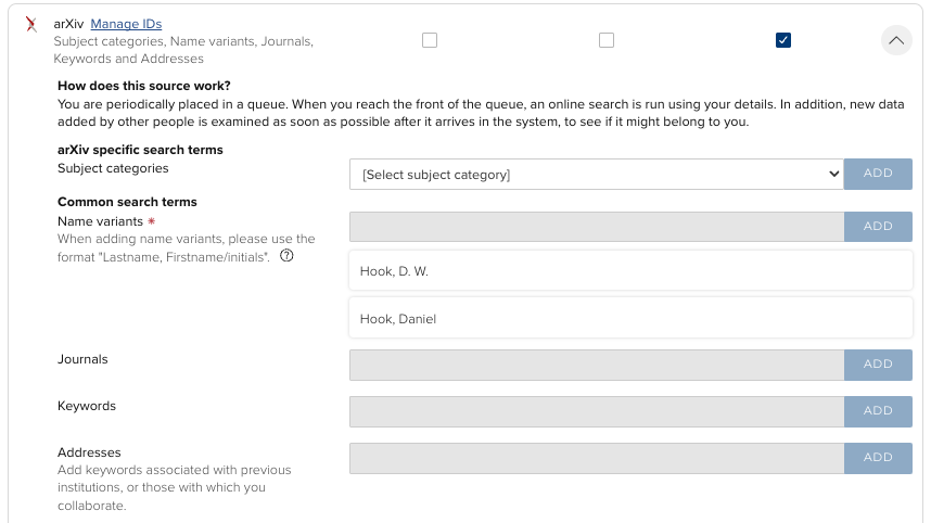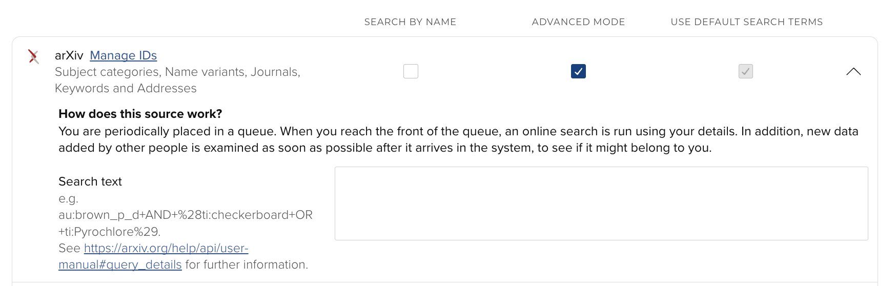 You will see a new section of the screen with any source-specific search terms at the top (the example shown is arXiv) and a set of search terms, including name, address, keywords and journals, below.