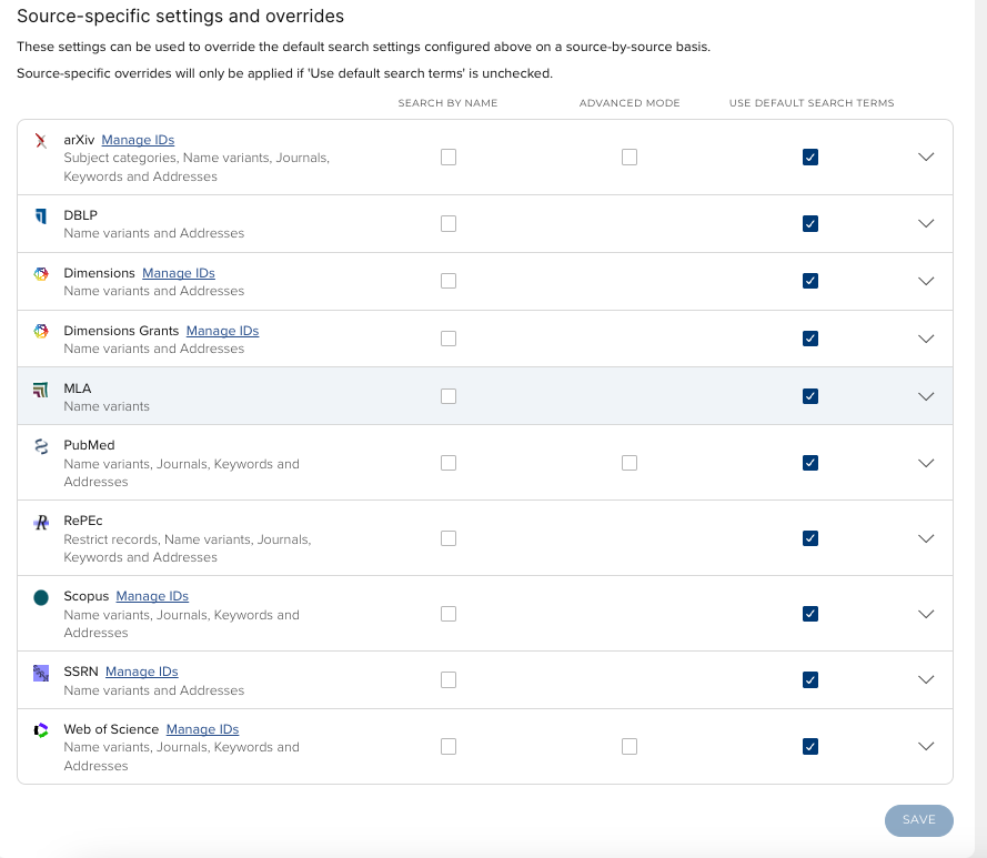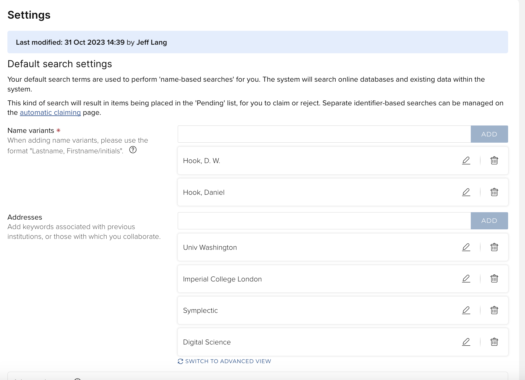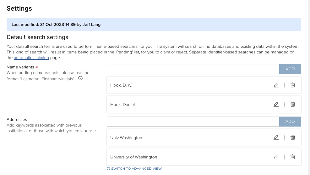 In the Name-based search settings section, you can make changes to your initial search settings. The changes that most often need to be made are to add Name variants and to add previous institutions to the Addresses area.