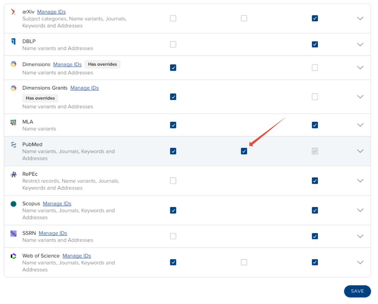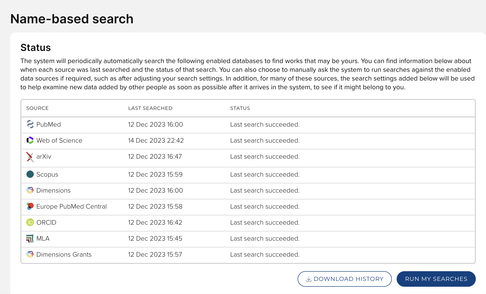 Also: If a database has been deactivated using named-based searching, but is searched using an author identifier (such as an ORCID), the the searched database will appear in the Status section at the top of the page.