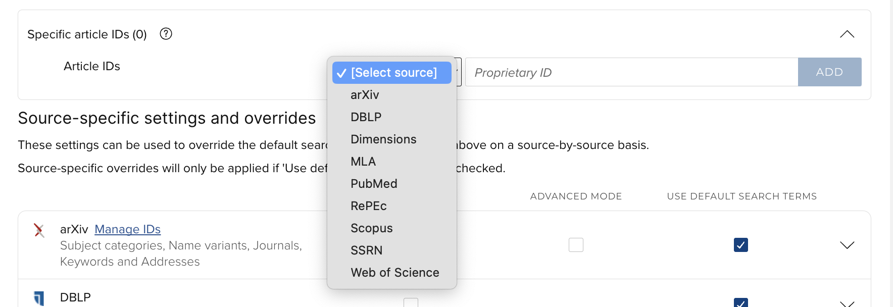 Specific article IDs can be used to retrieve individual articles that can't be harvested using name-based search settings. For more details about Specific article IDs, see Appendix A, below.