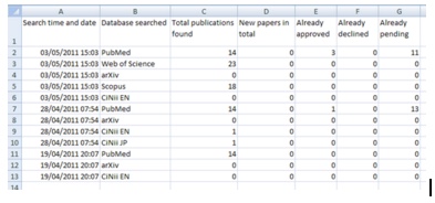 After the searches on 19/04 and 28/04, this user approved three of the publications found and left some in the 'pending' area. These were then matched against the results of the most recent search on 03/05, as shown in the final three columns.