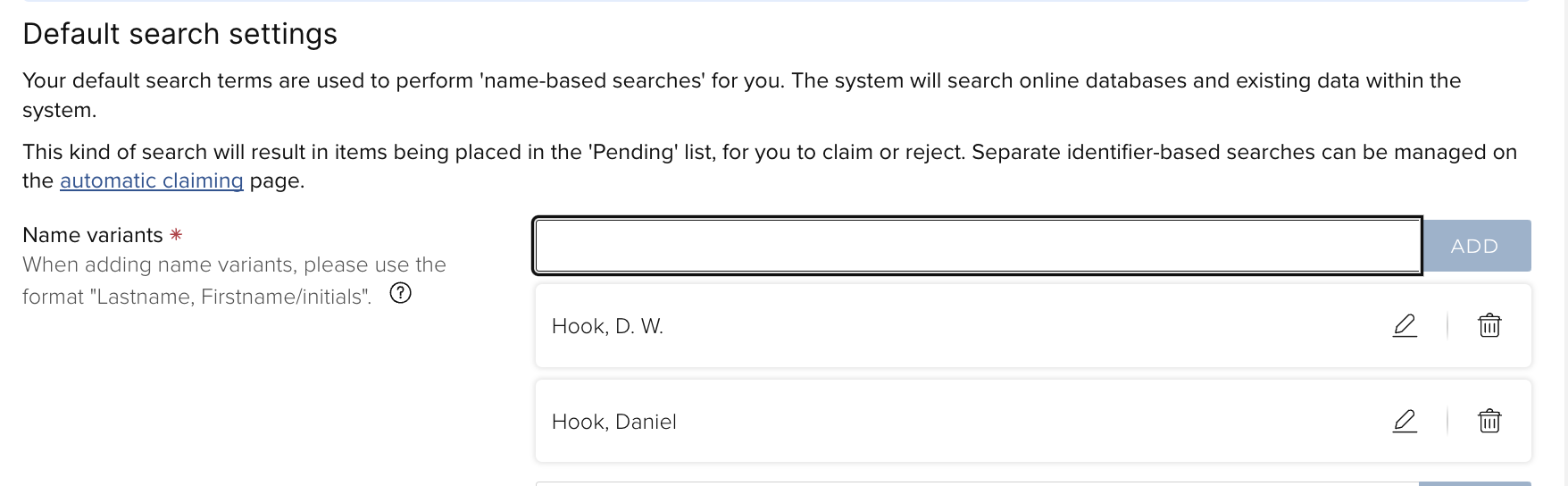 Please note: Turning off name-based search terms will not necessarily disable all searches if the author has claimed author identifiers (such as a Scopus author identifier or ORCID) under Automatic claiming.