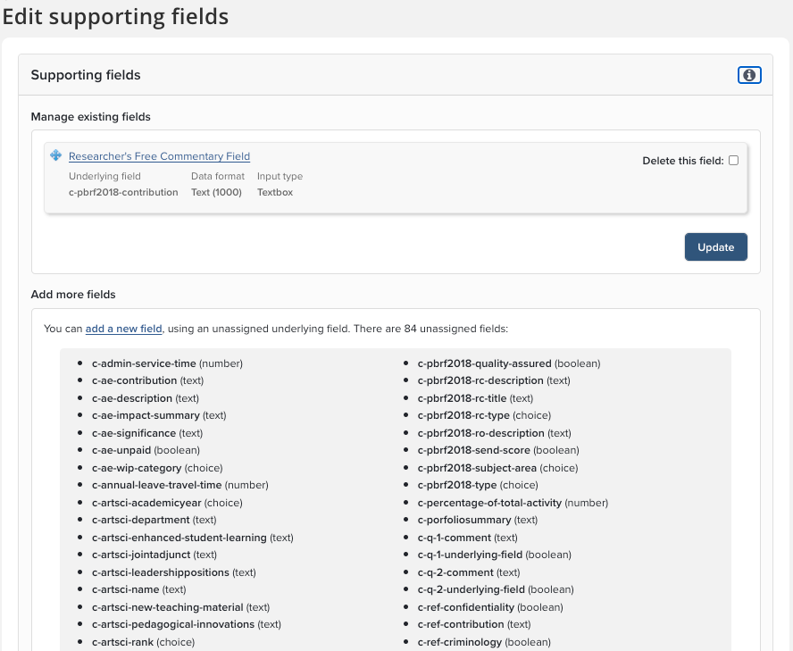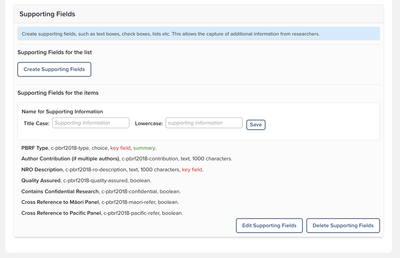 The Supporting Fields that have been pre-populated can be deleted or re-ordered to suit your institution at the properties page.