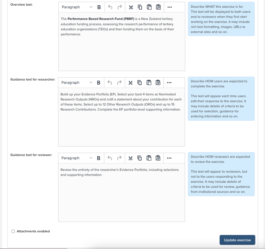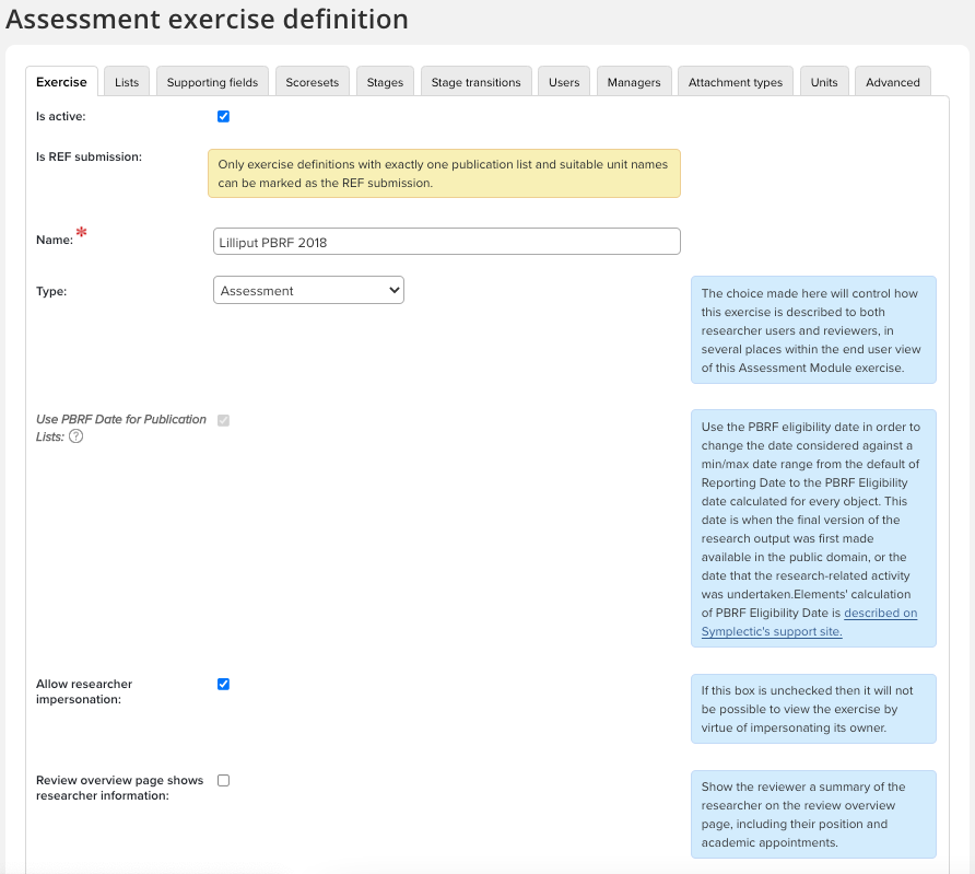 An Assessment Exercise is made up of lists and supplementary information, like summaries or description fields. An Assessment Exercise will have a name; some examples are REF, PBRF, Research Quality Review, or any others defined by your institution