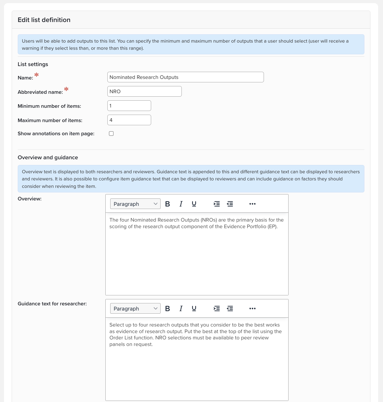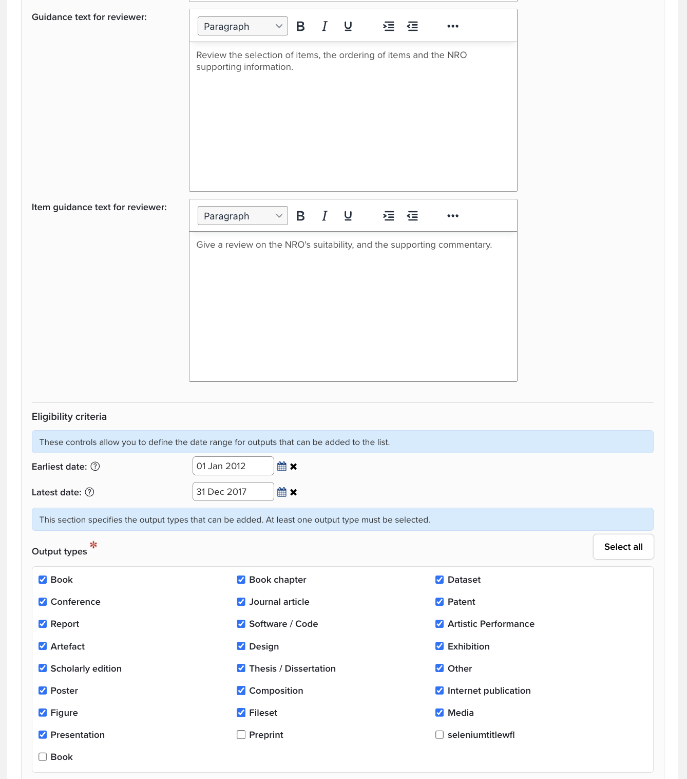If you choose a template, default lists will pre-populate your exercise, but you can change some components to suit your institution. Customise the overview and guidance text as needed. If you have a list that is made up of objects from Elements, then you can add or delete types and alter the settings for review and visibility using the check boxes. The supporting lists for a list have also been pre-populated and can be deleted or re-ordered.