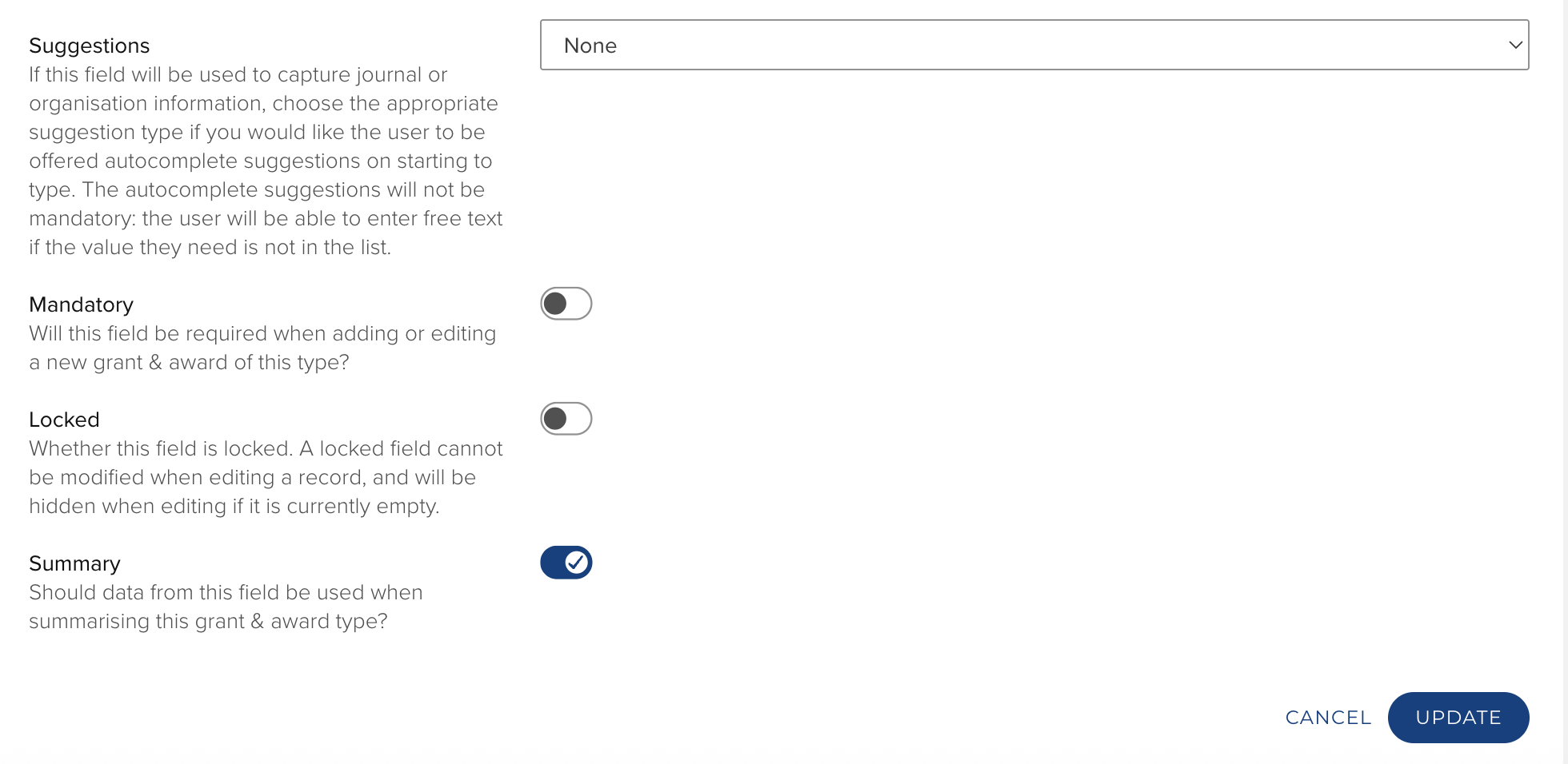 Record - title, number, date, funder and amount are taken from the the highest data source precedence defined in System Admin > Data Sources > Data Source Management.