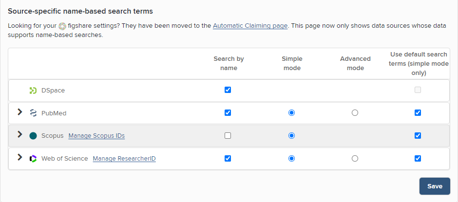 Once Elements has harvested the records from DSpace, the offline search functionality within Elements will match those records to users. To do so, the data sources and user search settings need to be configured to enable DSpace search which will assign DSpace items to the appropriate authors in Elements.