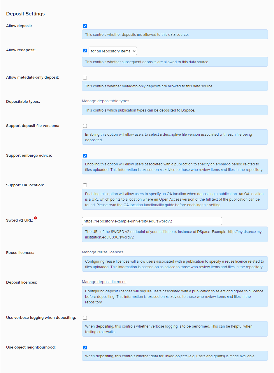 Important! Before you enable Deposit for the first time, ensure that a full harvest is complete. This will ensure that users cannot deposit duplicates of publications that are already in the repository.