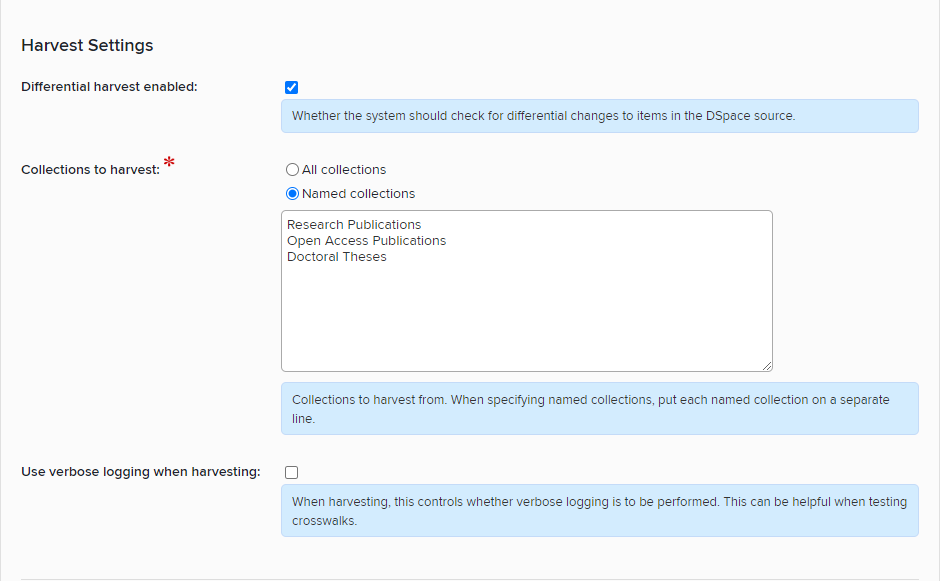Collections to harvest: Select whether to harvest from all collections or only from named collections. If harvesting from named collections enter the names of the collections to harvest from. Be sure to: