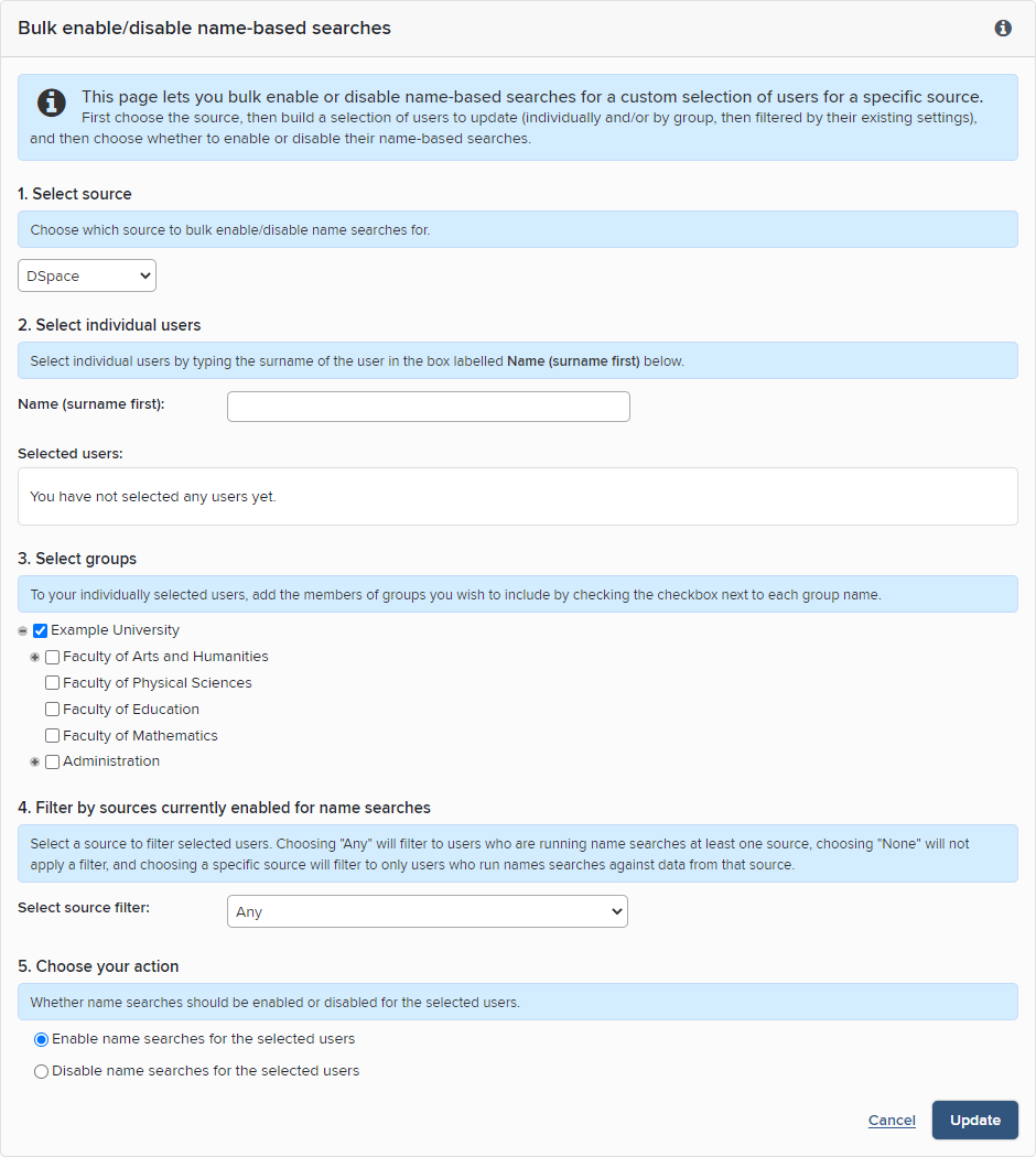 Users are now allowed access to search DSpace data but search has not yet been configured. Next you need to bulk update your users' search settings to enable that DSpace search on their behalf. To do this, go to System Admin > Data Sources > Manage Bulk Searches. Select the DSpace RT2 data source and the users or groups of users for whom you wish to enable DSpace data searches. Choose to "Enable search for the selected users" and click update.