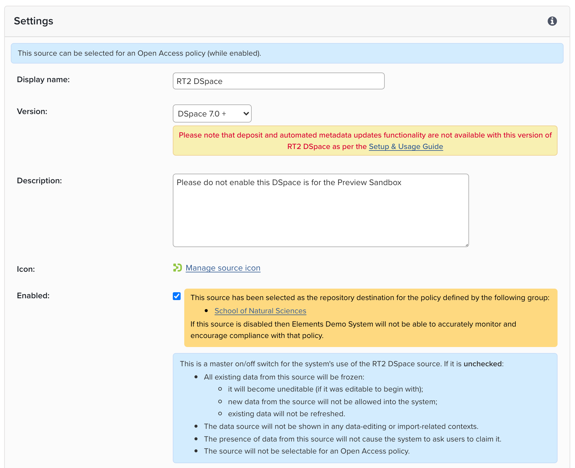 Setup & usage guide: You should confirm that you have read the Setup and Usage Guide for DSpace. This contains important information about the setup of your connection between Elements and DSpace. The data source cannot be enabled until someone has accepted this setting.