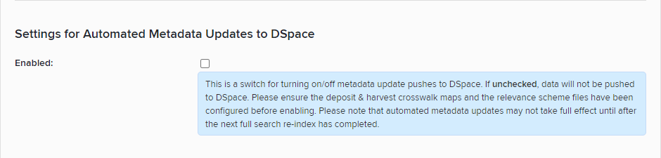 Important! Automated metadata updates require detailed configuration via the relevance scheme and field authority list(s) before use. If you have not configured these, keep automated metadata updates disabled.