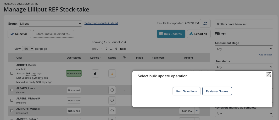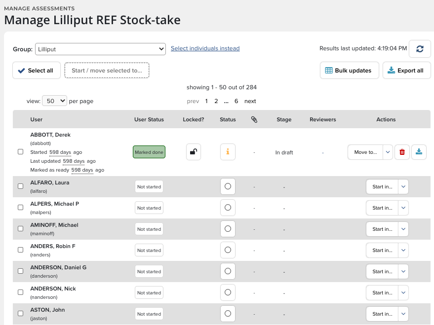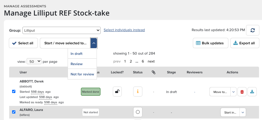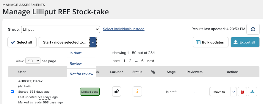 Use the Select all button to manage the actions of groups of users all at once. For example the Assessment Manager could shift an entire group to another stage with the click of a link.