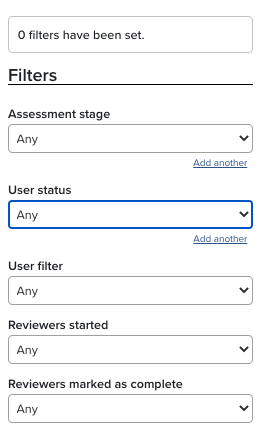 The filters on the right side of the page give the Assessment Manager the option to filter authors by Assessment stage, User status, User filter, Reviewers started, and Reviewers marked as complete.