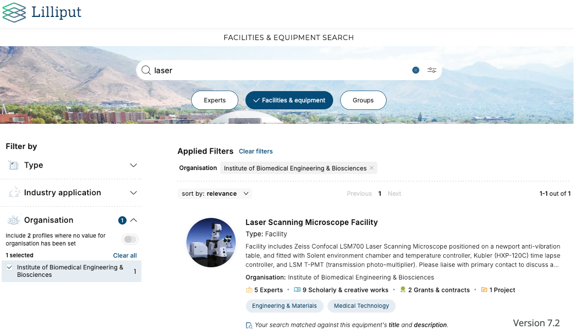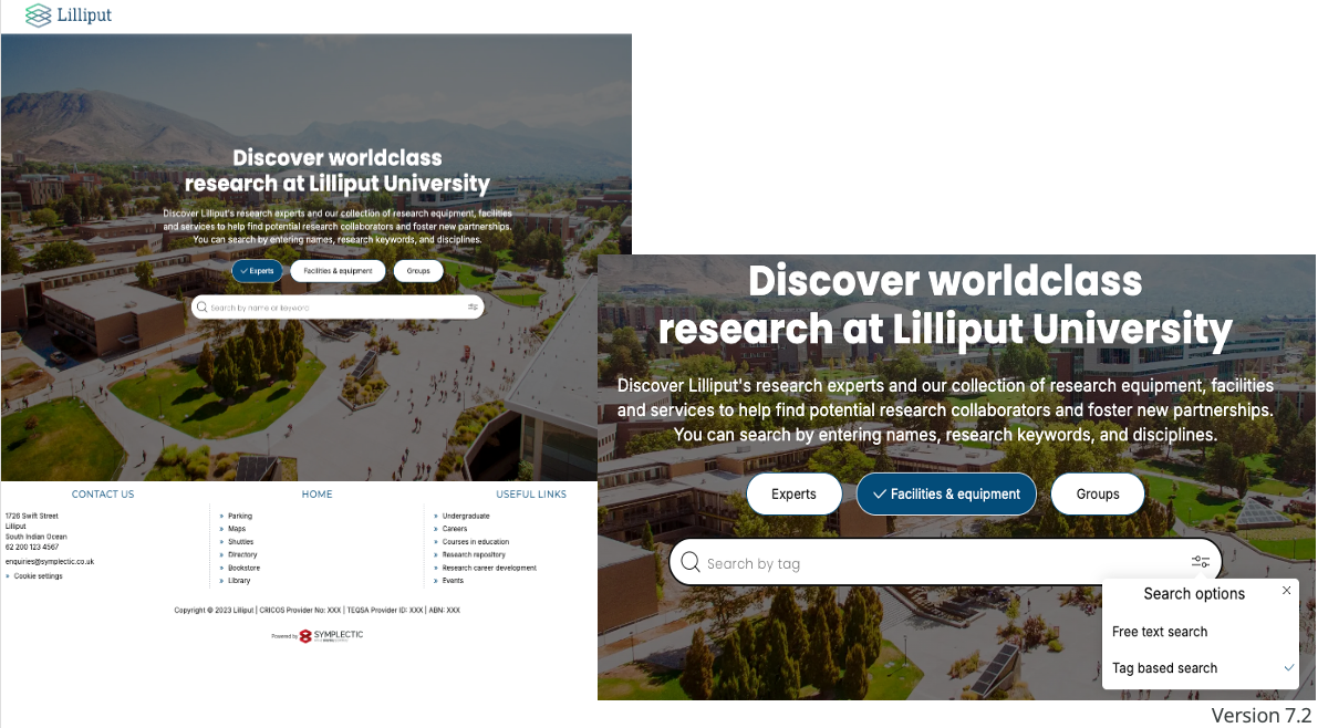 How do you search on the landing page? | Use the toggles above the search box to switch between Expert, Equipment, or Group search. Expert search is selected by default. Use the Control icon in the search box to choose between free-text search or by tag based search. Notes: tags appear on the Search Results page and can be used as filter following a free-text search. |