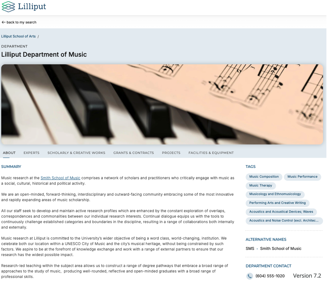 What is the landing page? | The landing page is the doorway to your Discovery profiles. It can be configured to display institutional branding and local links (see the Branding section on this page for more detail), and includes search functionality by category: Expert, Equipment, and Groups. Note: these are the default names used, but other options are available. Facilities & Equipment and Groups categories are optional and can be enabled/disabled via the Discovery Configuration page in Elements. |