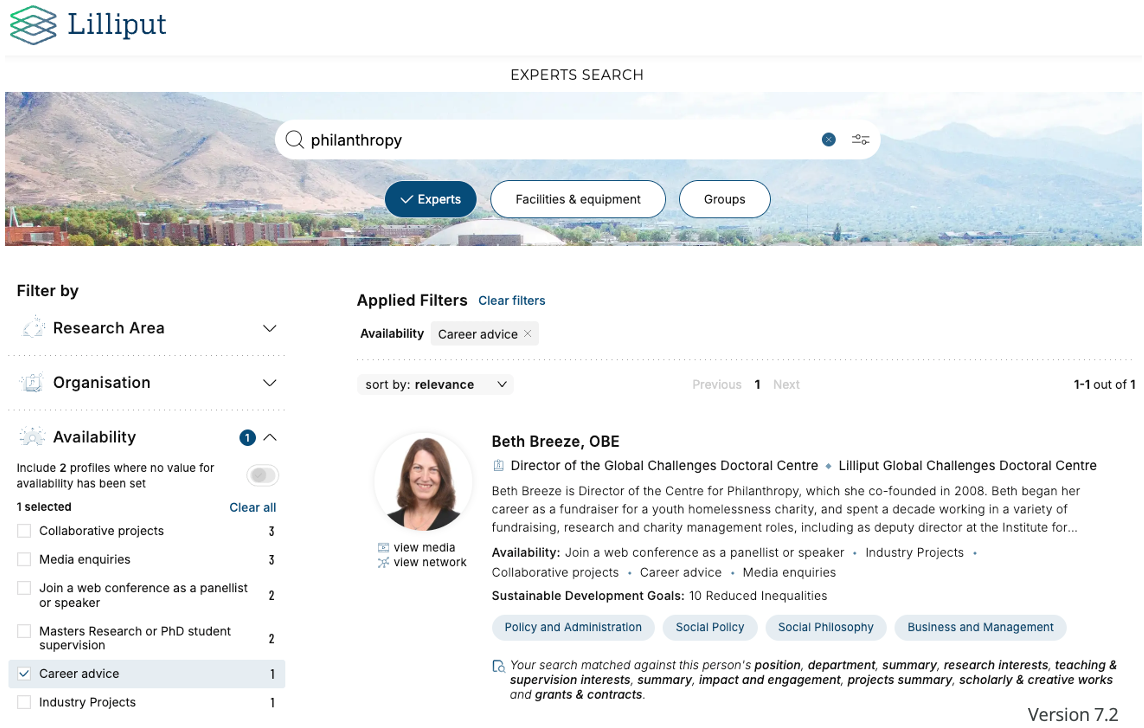 What information is included in an Experts search results page? | Results can be ordered by relevance (default) or last name. A number of optional filters can be included. Each profile will display the following data (if populated):