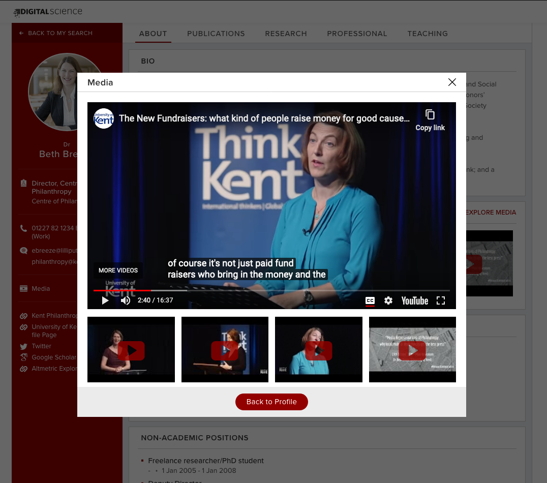 As part of the Symplectic applied configuration, we can switch on a Media section for the Discovery Module which enables YouTube videos to be shown as a section on the "About" page of a public profile. This allows visitors to watch videos users have added to their profile by clicking on a ‘View Media’ link on the researcher’s profile page or the Discovery Module search results page.