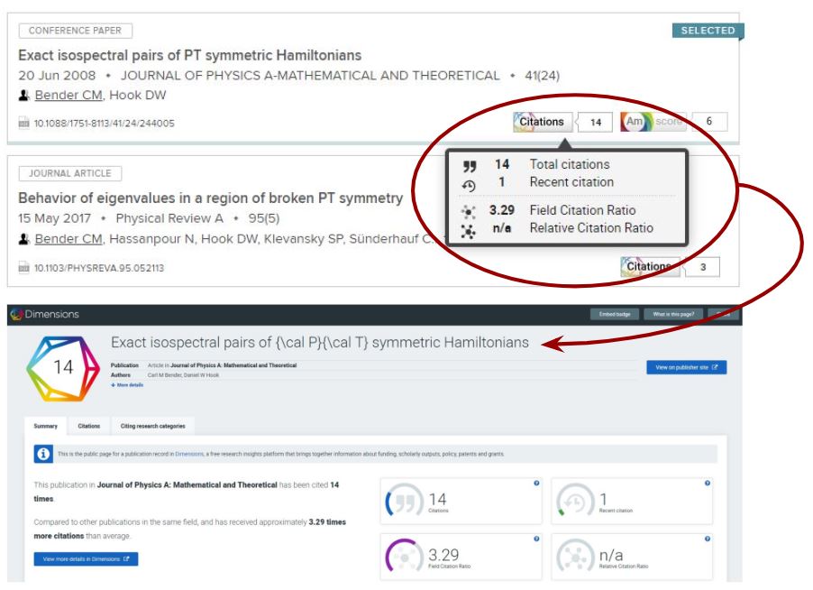 The Discovery Module will display Dimensions Citation Counts by default. This is to highlight publications which have received scholarly attention and to provide additional links through which users can discover more about the article.