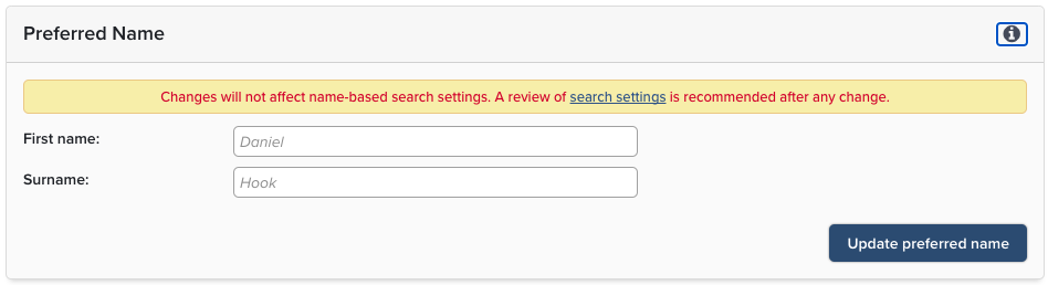 The addition of a preferred name will not affect name based publication search settings and these should be updated separately. A warning is displayed to users in a prominent position when they add a preferred name.