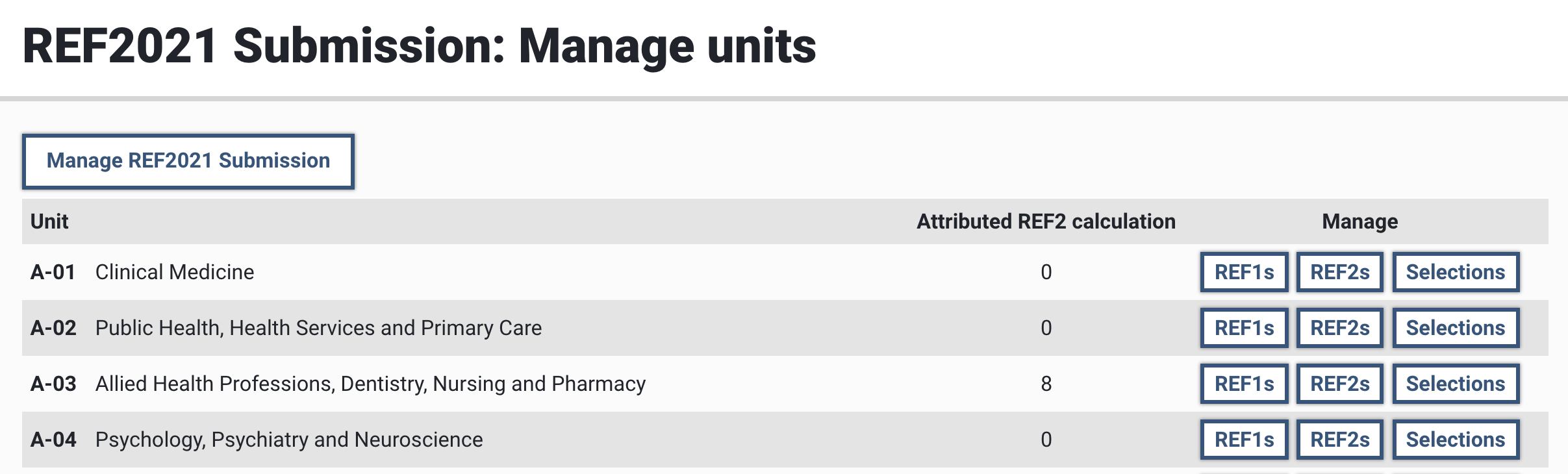 The short name of each of your units in your REF2021 submission must match the standard REF2021 UoA list employed in Elements . Your list should adhere to the following format: