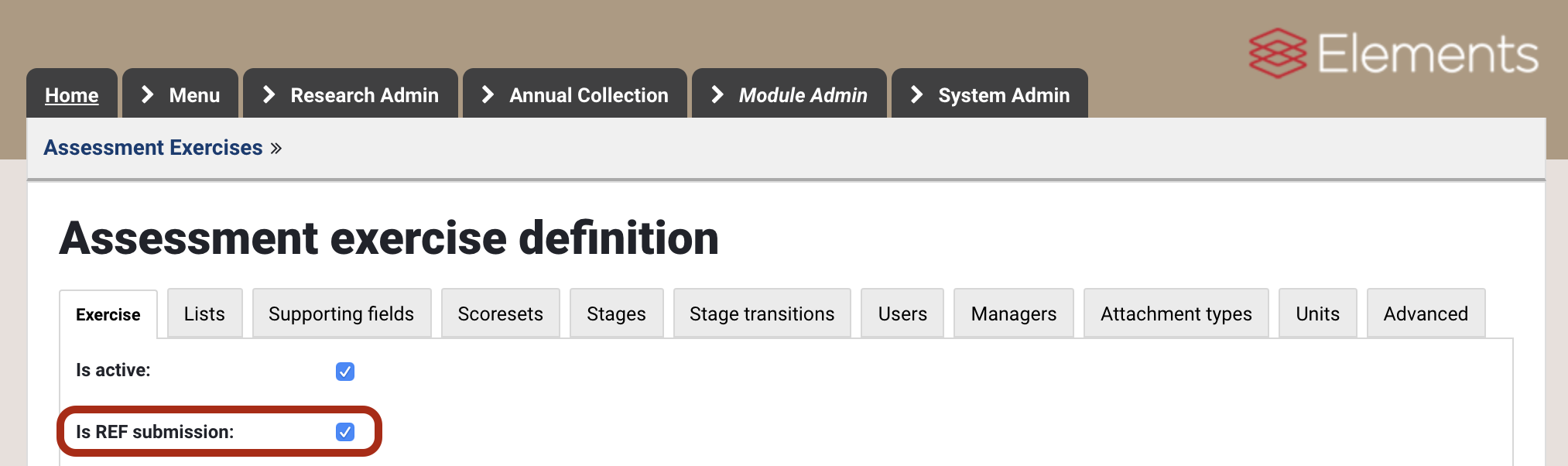 Go to Module Admin and choose the Exercise definition you would like to flag as your REF submission. In the 'Exercise' tab, you will see the option to flag the Exercise definition as 'Is REF submission'.