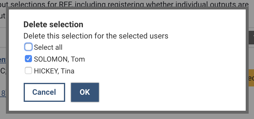 If the individual is one of multiple co-authors in the UoA that selected the output, you will be presented with an option to select which individual researcher(s) for whom you would like to remove the selection, or whether you would like to remove the selection for all researchers.