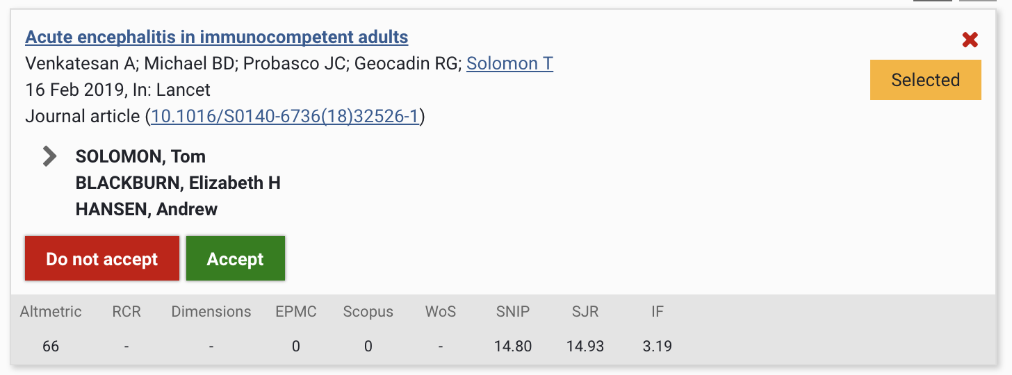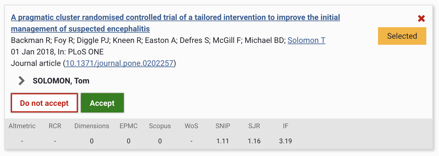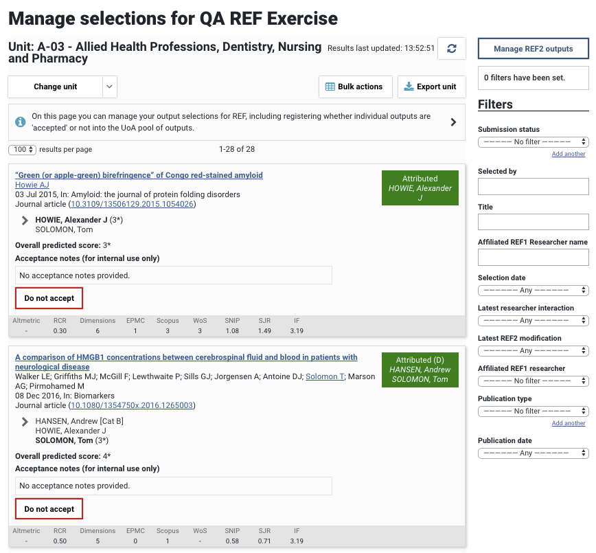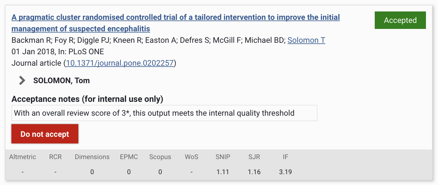 For each output selected in the UoA, you have the choice to Accept or Not accept the output for the REF submission.