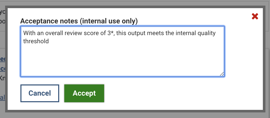 To Accept an output, select the green Accept button. The option to Accept is available if the output is in the Selected or Not accepted state. It is also possible to capture notes relating to the acceptance decision (these are not visible to users).