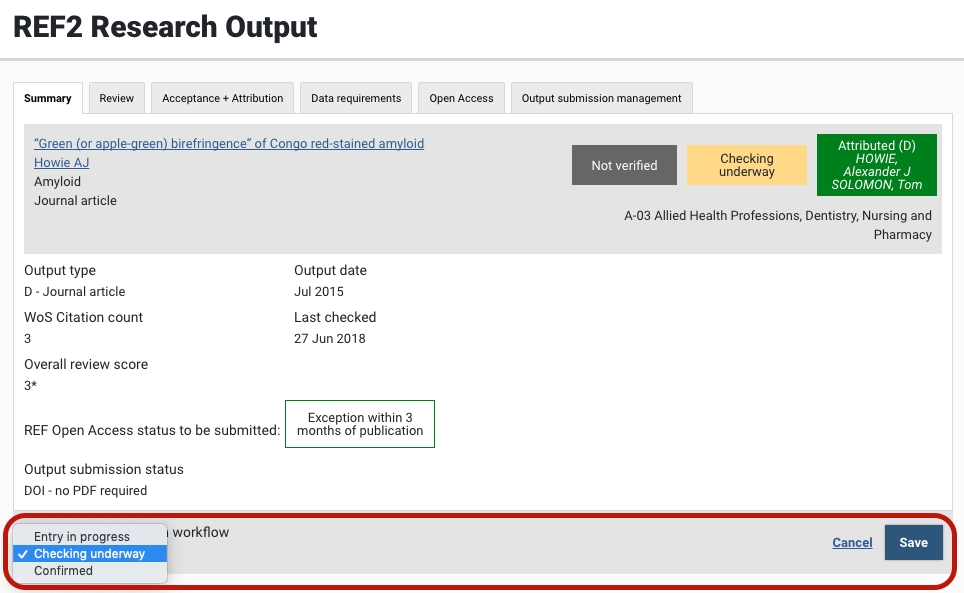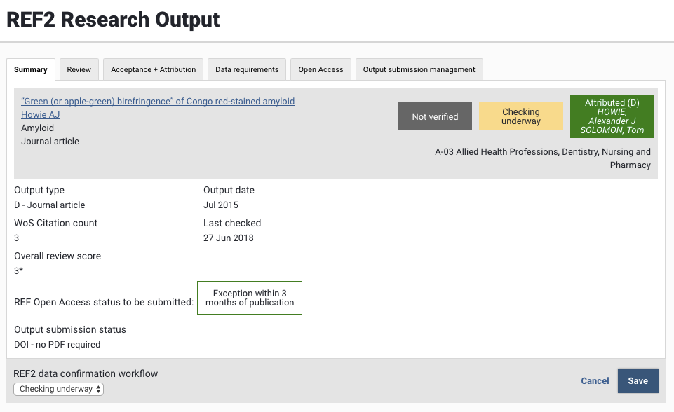 Display current Open Access compliance status, mapped to the REF OA compliance status, with the function to override | |