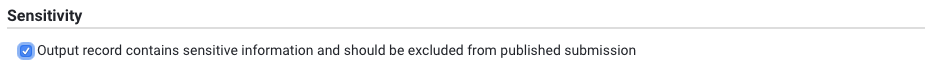 Output record contains sensitive information and should be excluded from published submission | Indicate whether the output should be omitted from the published data for specific reasons, such as commercial sensitivity or security |