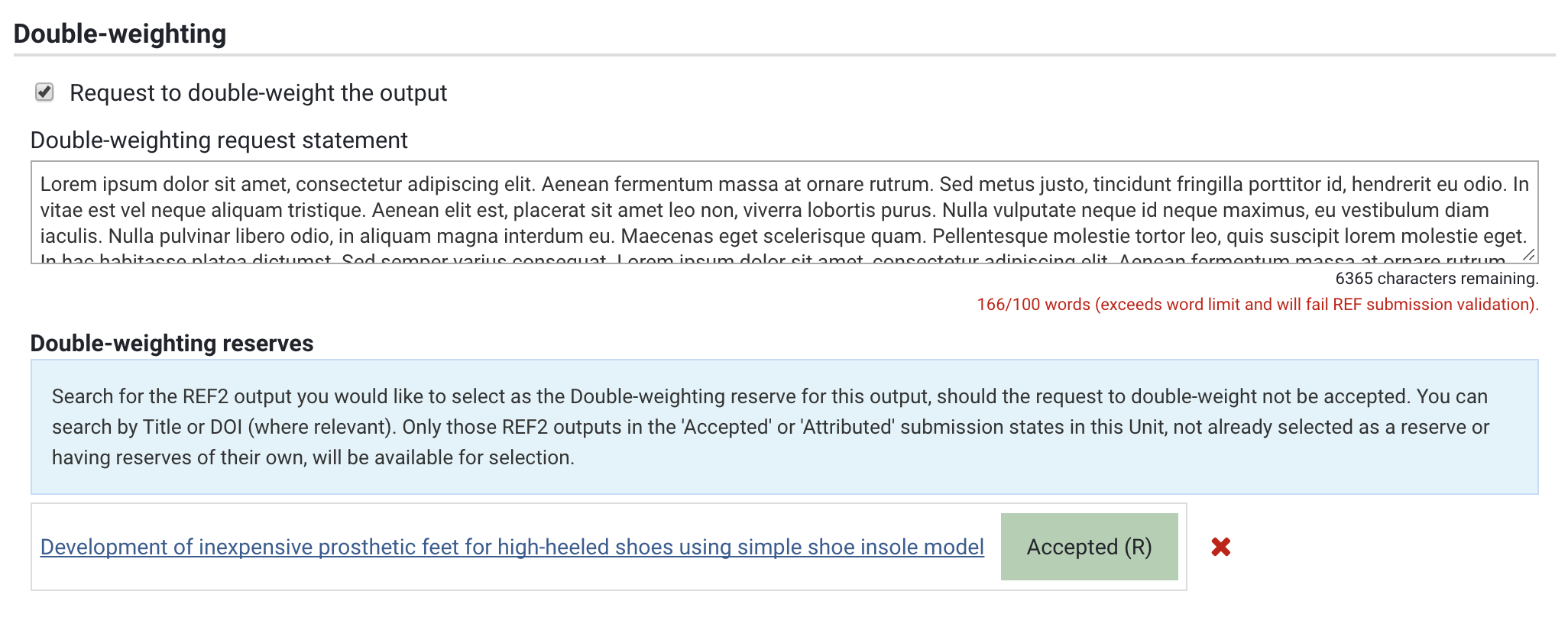 For outputs of extended scale and scope, you may request that the sub-panel weights the output as two. This section enables you to flag an output as double-weighted, provide the necessary statement explaining how the scale and scope of the output satisfies the criteria, and select a reserve should the request not be granted.