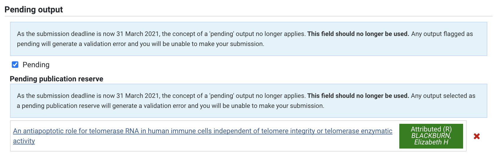 As the submission deadline is now 31 March 2021, the concept of a 'pending' output no longer applies. This field should no longer be used. Any output flagged as pending or selected as a pending publication reserve will generate a validation error and you will be unable to make your submission.