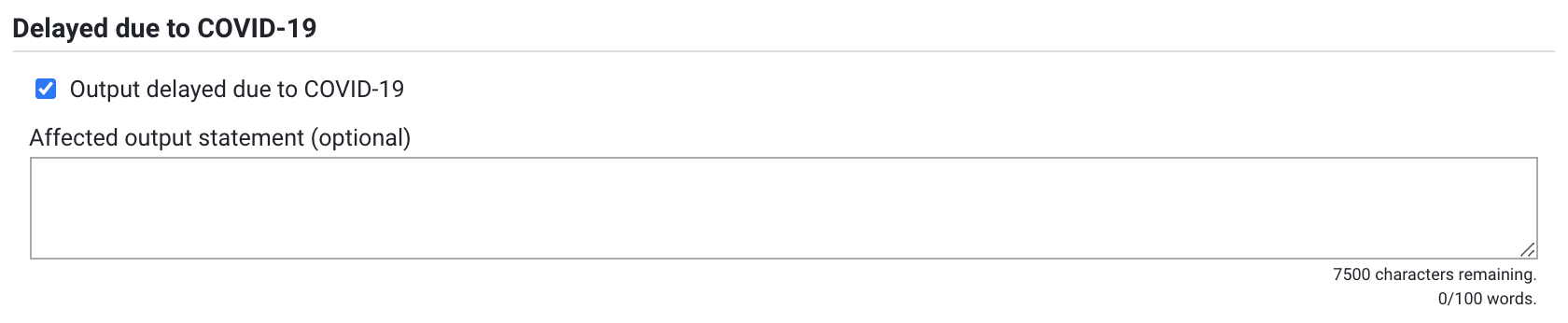 Affected output statement (optional) | Where a delayed output is submitted that is not yet in the public domain in its final form, an optional statement may be provided to explain the form of the submitted output. |