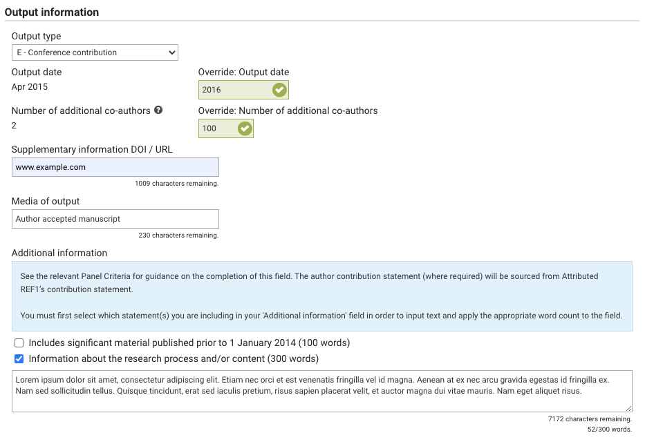 Number of additional co-authors override | Enables you to override the number of additional co-authors, where the value returned is not accurate | Where populated, the override value will be returned in the submission XML |