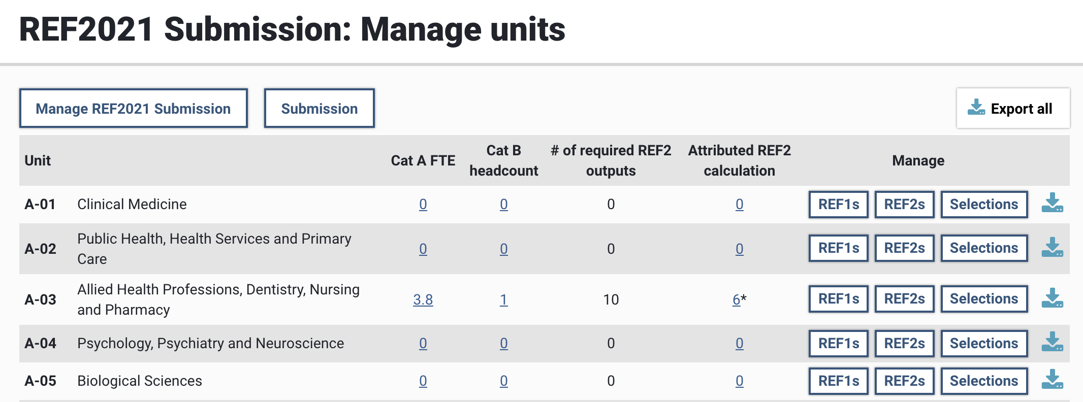 Cat A FTE | Sum of the FTE for all Category A staff included in the submission. An asterisk indicates that the Cat A FTE for the Unit has been overridden in the Unit form. Selecting the value will navigate you to the Manage REF1 Researchers screen, filtered for 'Category A' and 'Included in submission' |
