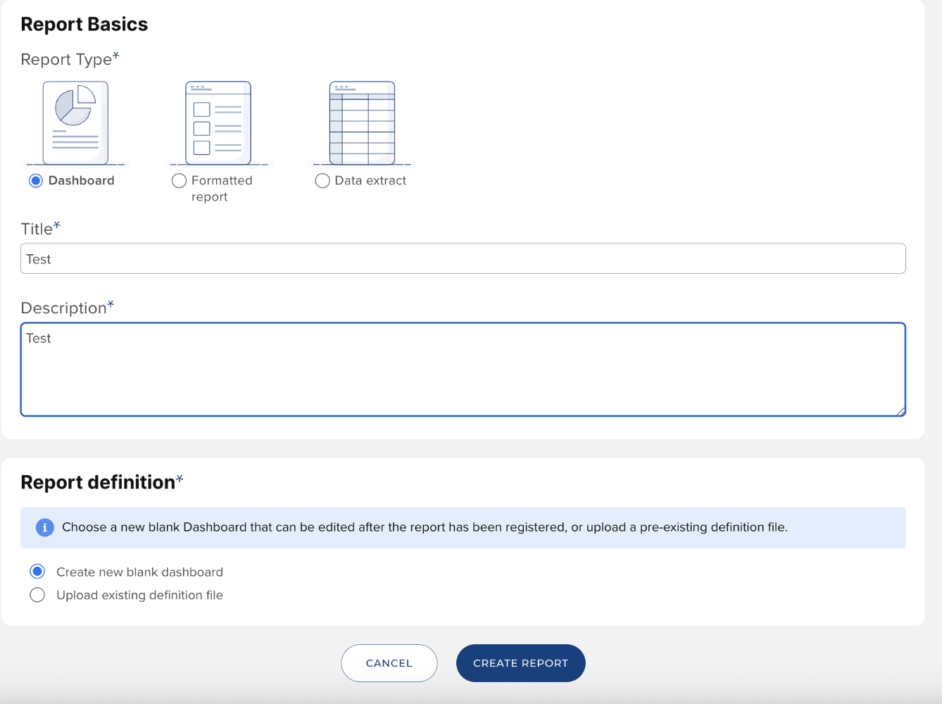 Keep the New Blank Dashboard option selected. Provide a display name for your dashboard, and a description. The name and description will be made available to all users to whom you later provide access to the dashboard. Click the Create button when you have finished.