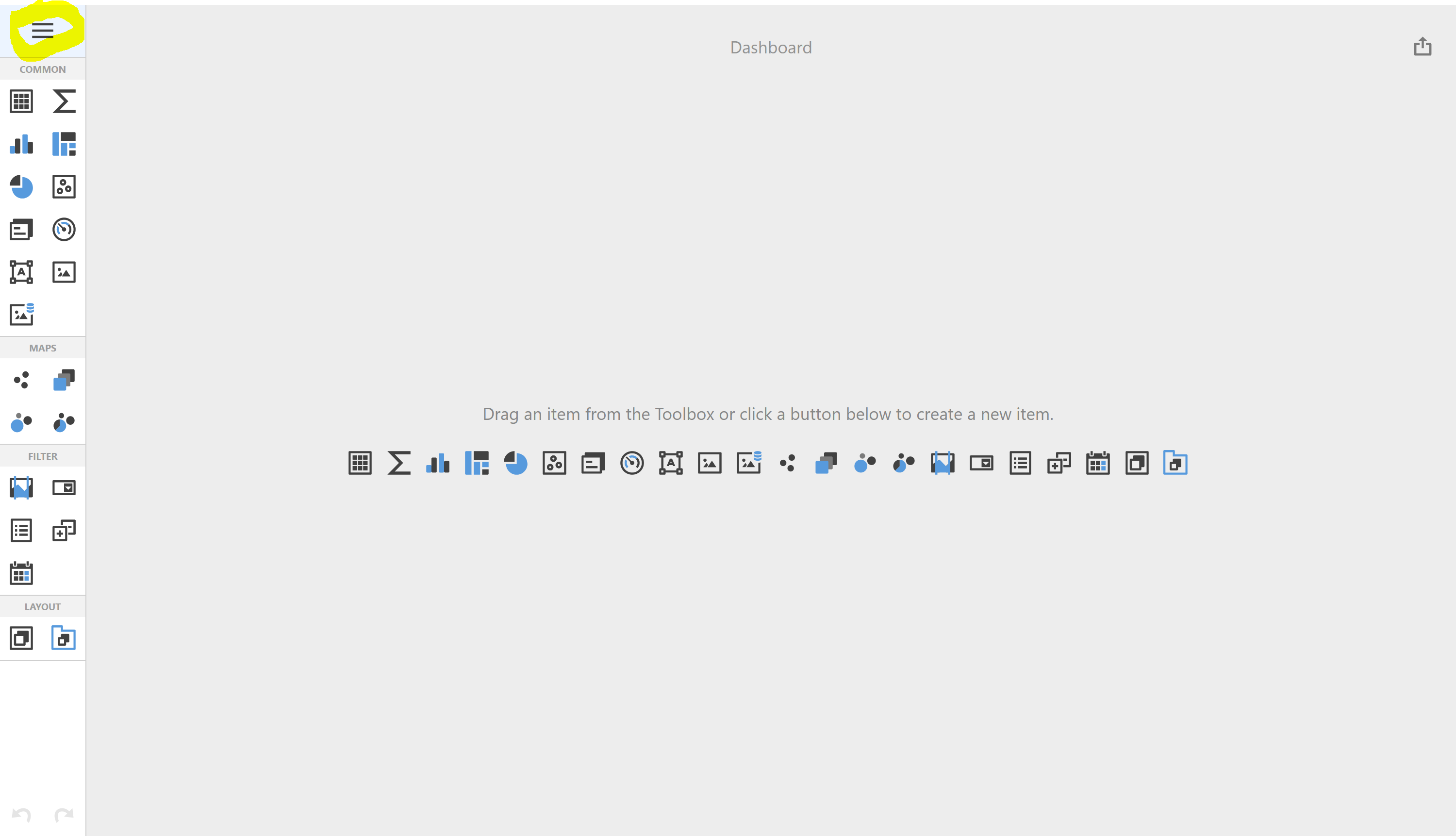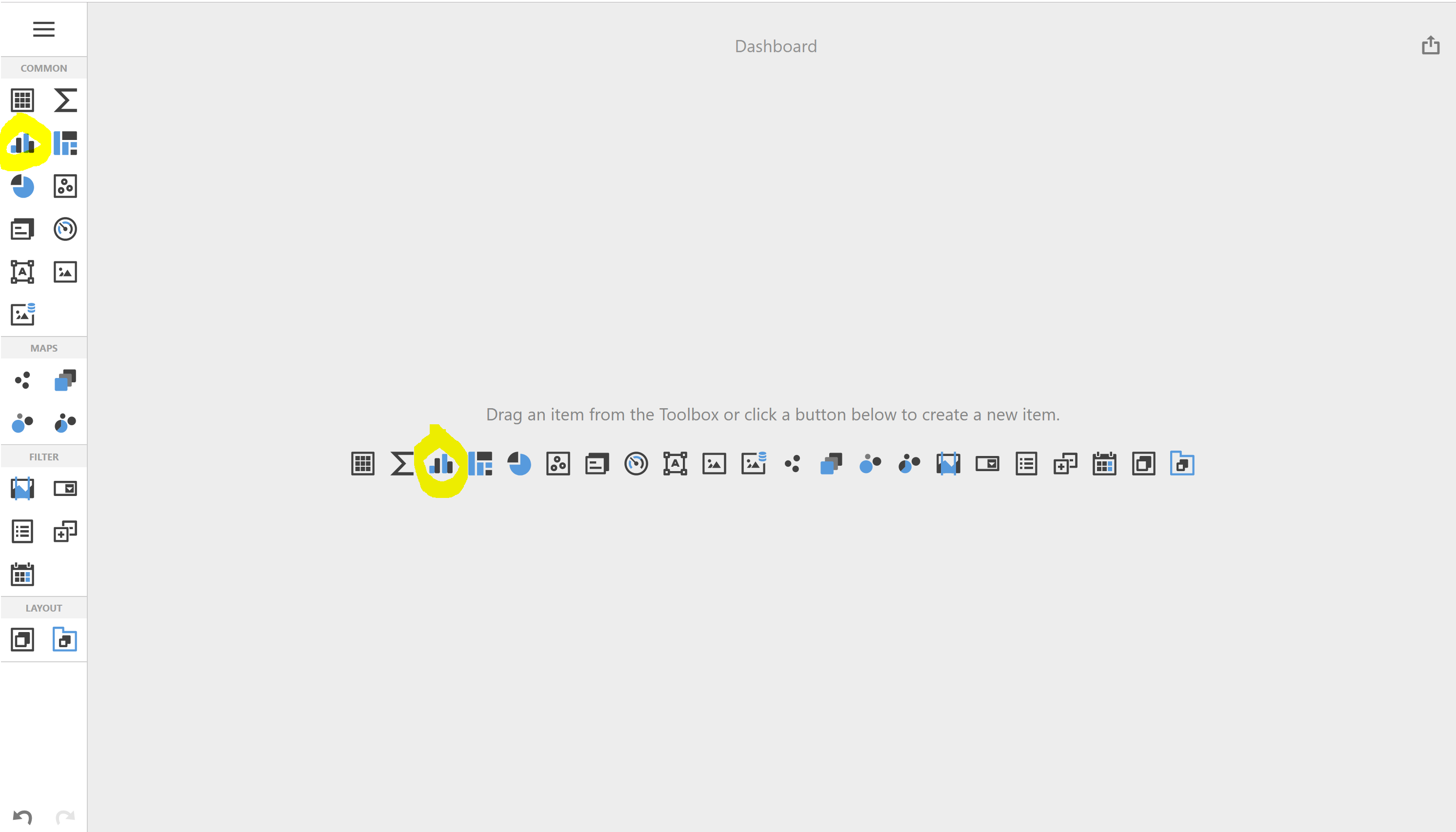 Now is a good time to save your changes. Click the Save button in the dashboard menu, which should still be open on the left of the window. This will cause the menu to close. Next, add a bar chart item to the dashboard by clicking on either instance of the bar chart icon: