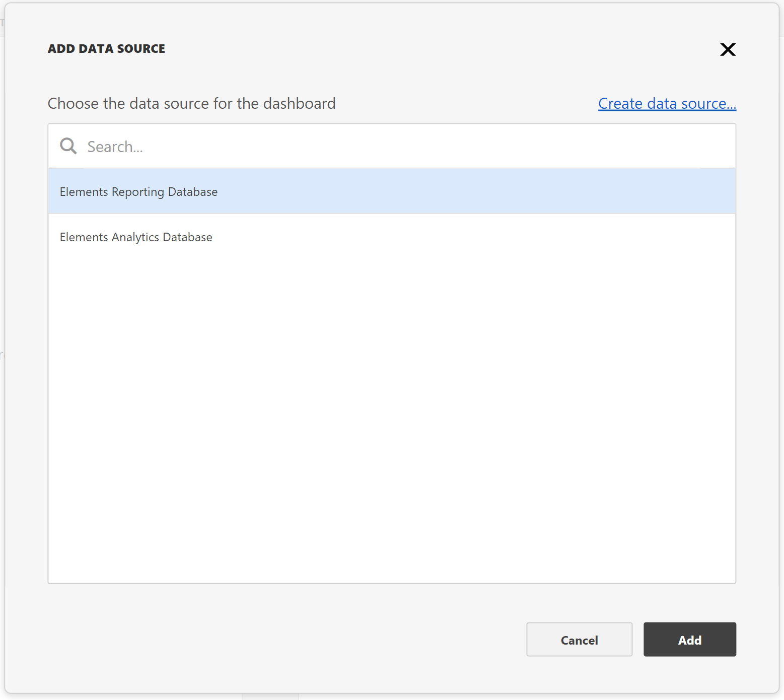 Elements supports just two data sources for dashboards. This article focuses on using the Elements Reporting Database as the data source (and for which SQL-based queries are appropriate). Select the Elements Reporting Database data source and click the Add button. There is an option to "Create Data Source...", but this does not offer the ability to choose a data source other than the two supported data sources. Choosing that option will currently just permit you to create a new data source using one of the two underlying data connections used by the existing supported data sources. It doesn't get you anywhere new.