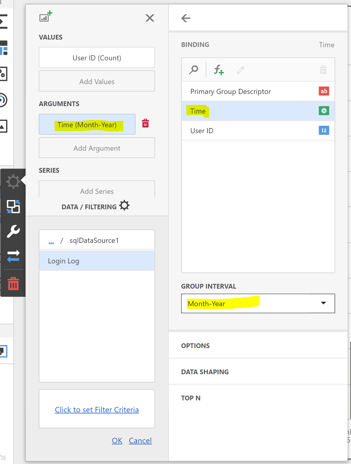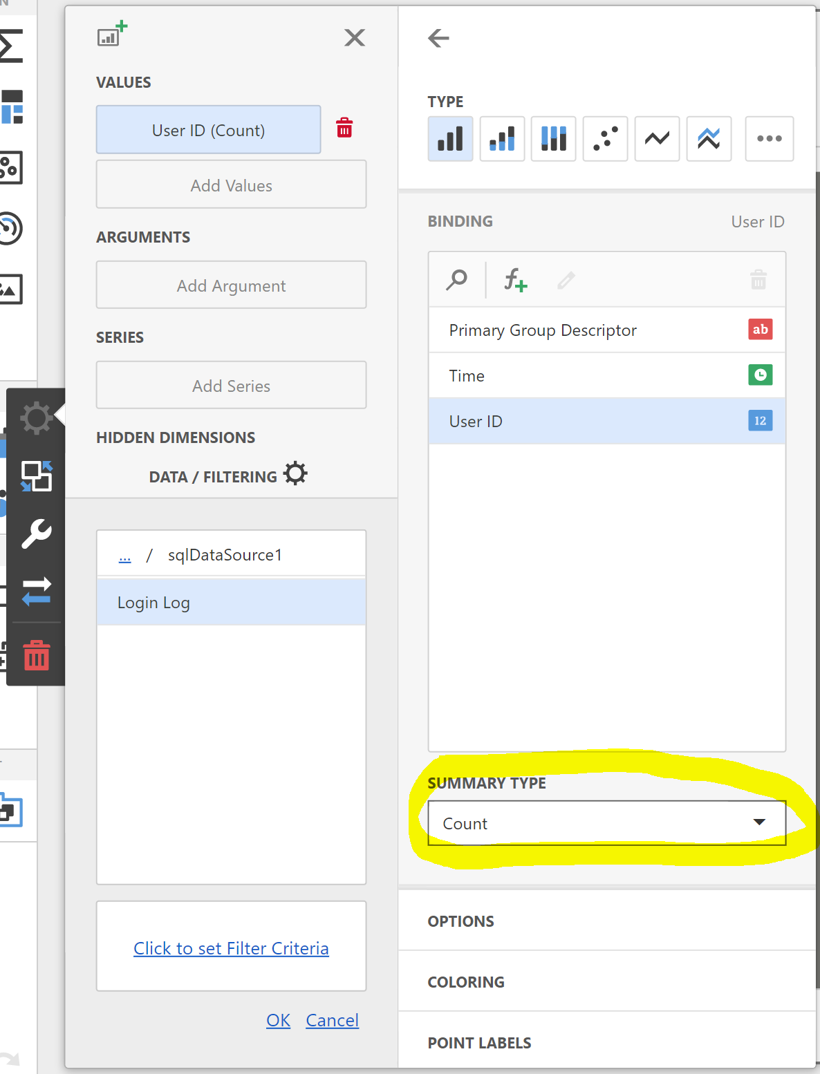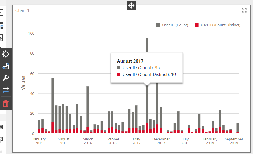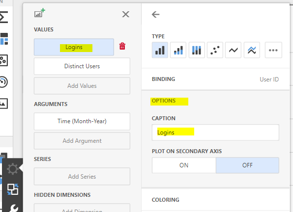 You can also see in the screenshot above the tooltip that is automatically shown by the chart when mousing over a bar, and the legend for the two series. These can be very helpful to viewers. By default, they show the name(s) of the bound column(s) and the function you chose when measuring them, but you can alter the display name of each binding to better describe what is being shown. Reopen the binding configuration and select the "User ID (Count)" value. Open the Options section to its right and enter the word "Logins" into the Caption textbox.